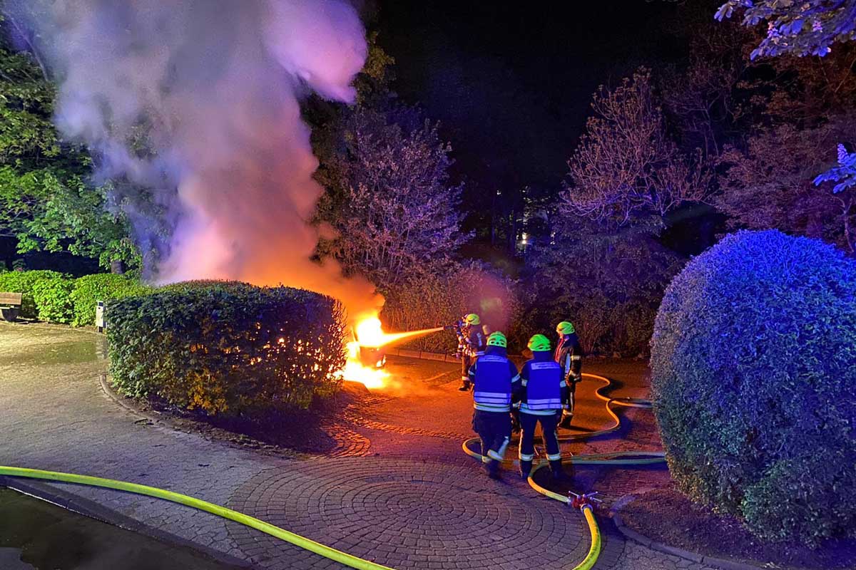 Beim Eintreffen der Einsatzkräfte stand gestern das Fahrzeug in Vollbrand. Sofort ging ein Trupp unter umluftunabhängigem Atemschutz mit einem C-Rohr vor. Zusätzlich wurde mit einem weiteren Rohr naheliegendes Buschwerk abgelöscht.