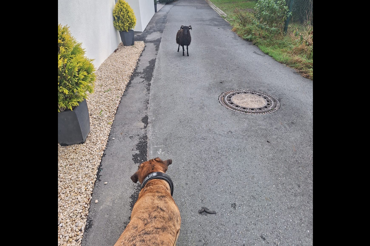 Mexican-Standoff zwischen Hund und Schafbock. (Bildquelle: Polizei Bochum)