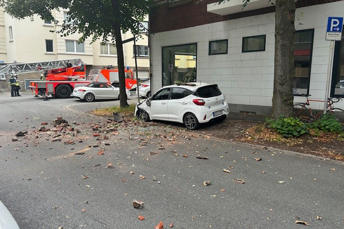 In Witten ist am Sonntagmorgen, 3. August 2025, der Aufsatz eines Kamins auf ein geparktes Auto gestürzt und hat auch das Dach des Hauses beschädigt. Drei Wohnungen wurden für unbewohnbar erklärt.