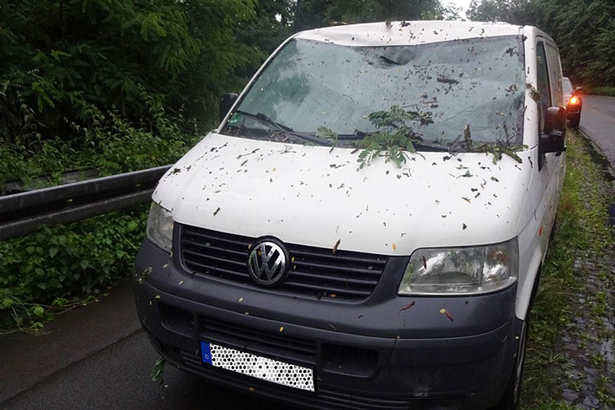 In Höhe der Hausnummer 148 stürzte plötzlich von rechts ein circa 13 Meter hoher baum auf die Fahrbahn und fiel auf die Frontscheibe des Transporters. Dadurch wurde der 41-Jährige leicht verletzt und begab sich selbstständig in ein krankenhaus.