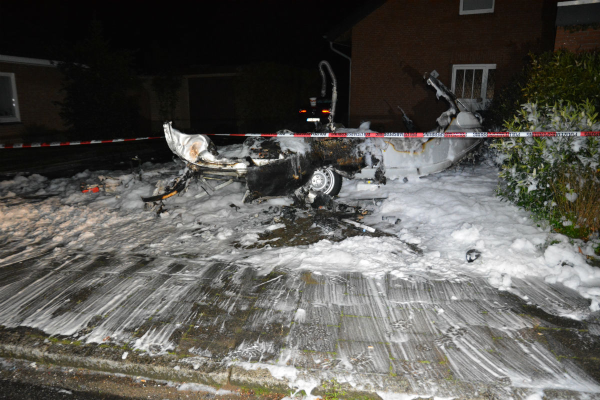 In der Nacht zum Sonntag wird ein Wohnwagen in Zeven komplett durch ein Feuer zerstört.