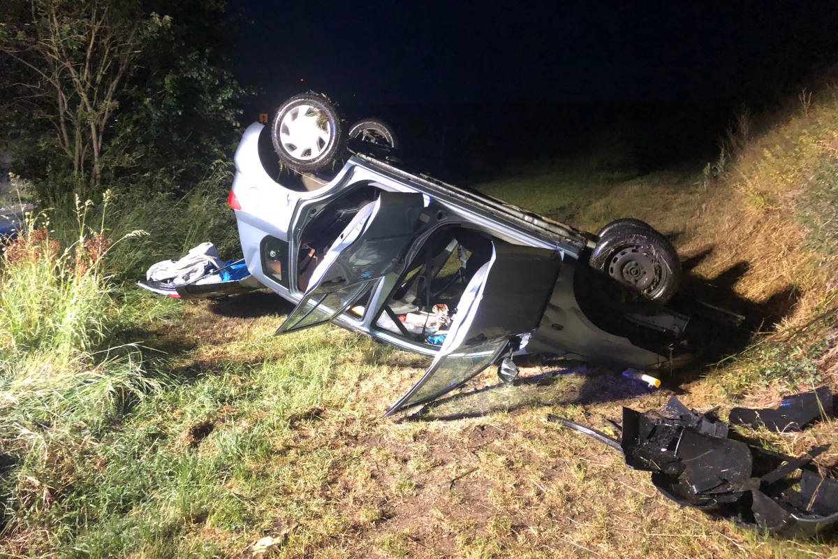 Vermutlich aufgrund nicht angepasster Geschwindigkeit verliert sie nach einer Linkskurve die Kontrolle über den Wagen und kommt von der Fahrbahn ab. Der PKW überschlägt sich und kommt schließlich auf dem Fahrzeugdach zum liegen. Alle drei Insassen im Alter zwischen 17 und 19 Jahren sind in der Lage, das Fahrzeug selbständig zu verlassen und werden nach ersten Erkenntnissen mit leichten Verletzungen in umliegende Krankenhäuser verbracht. Glücklicherweise waren alle Insassen im Augenblick des Unfalls angeschnallt, was schwerwiegendere Verletzungen verhindert haben dürfte. Die Kreisstraße musste für die Dauer der Unfallaufnahme und der Bergungsarbeiten für etwa zwei Stunden vollgesperrt werden.