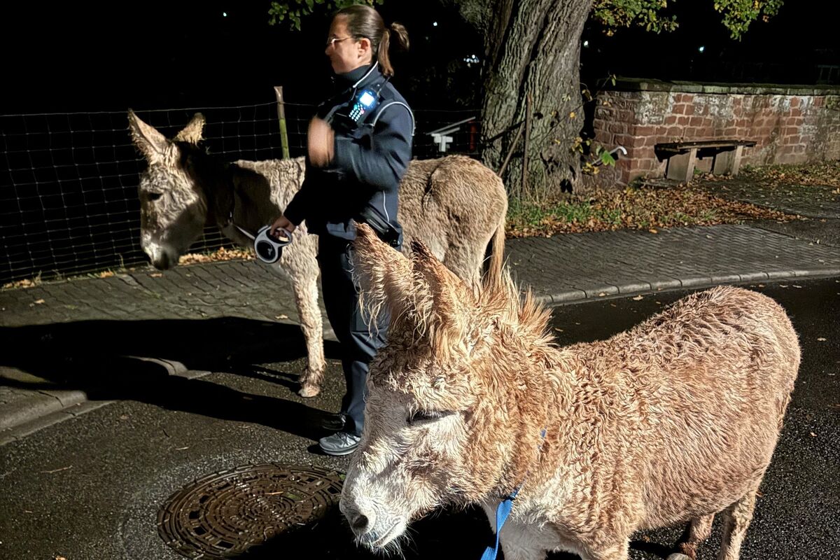 Ein Zeitungsausträger meldete der Polizei zwei freilaufende Esel in der Maler-Müller-Straße. Die beiden Tiere konnten dann in der unbeleuchteten Hienstraße mitten auf der Fahrbahn von einer Polizeistreife festgestellt werden.